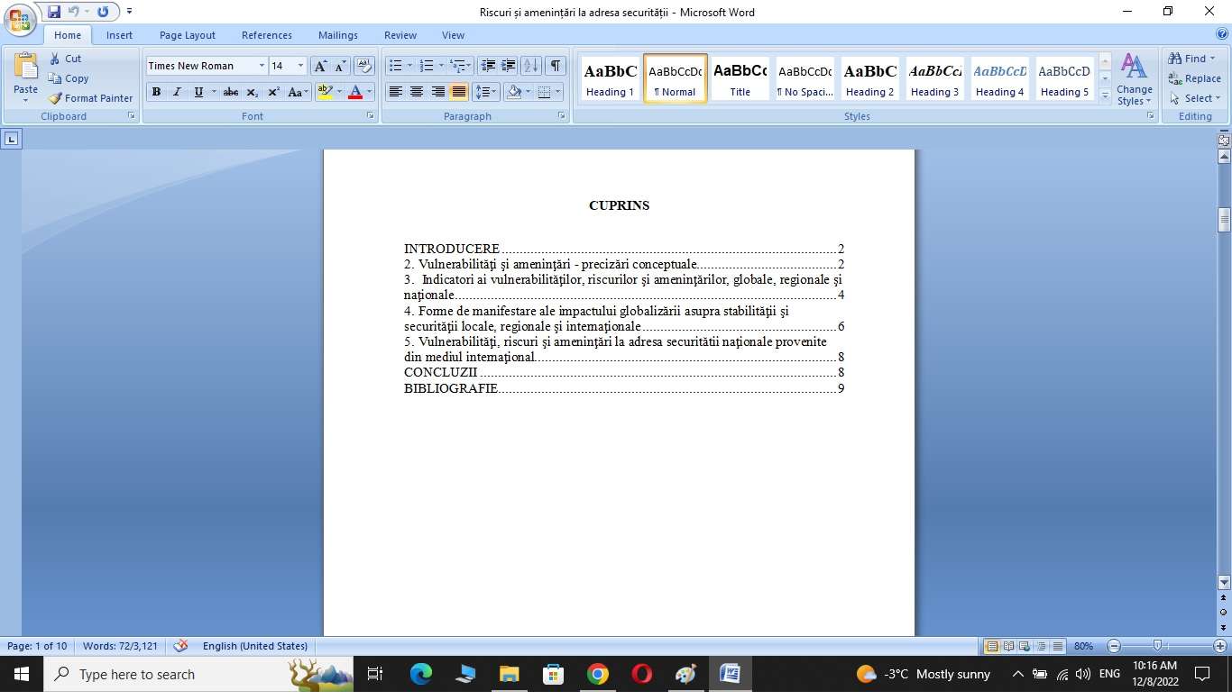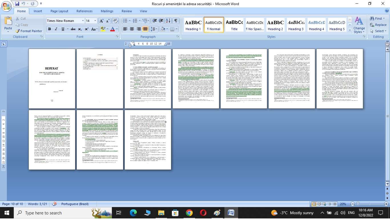 Riscuri şi ameninţări specifice proceselor care însoţesc globalizarea. Scopul acestui referat este de a reda amploarea fenomenului globalizării si prezentarea principalelor riscuri şi ameninţări specifice proceselor care însoţesc globalizarea. În referatul de faţă am abordat tema procesului de globalizare prin prisma modului în care ne influenţează viaţa, luând în analiză patru aspecte importante: economic, politic, social și cultural, elemente care în final se restrâng asupra înţelegerii globalizării din punctul de vedere al schimbărilor socio-economice ce se petrec la nivel global.